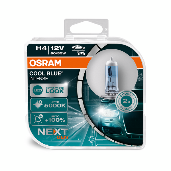 Mit der COOL BLUE® INTENSE H4 Duobox entscheidest du dich für mehr als nur eine einfache Autolampe – du setzt auf moderne Technologie, erstklassige Leistung und ein markantes Design. Die H4-Lampen aus der beliebten COOL BLUE® INTENSE Serie von OSRAM erzeugen ein strahlend weißes Licht mit einer Farbtemperatur von bis zu 4.200 Kelvin und kommen dem Look moderner Xenon-Lampen extrem nahe – und das bei voller Straßenzulassung.