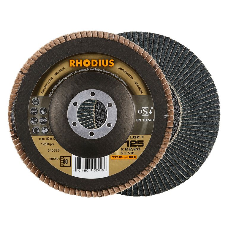 Eigenschaften der RHODIUS LGZ F 125 x 22,23 Fächerschleifscheibe 80